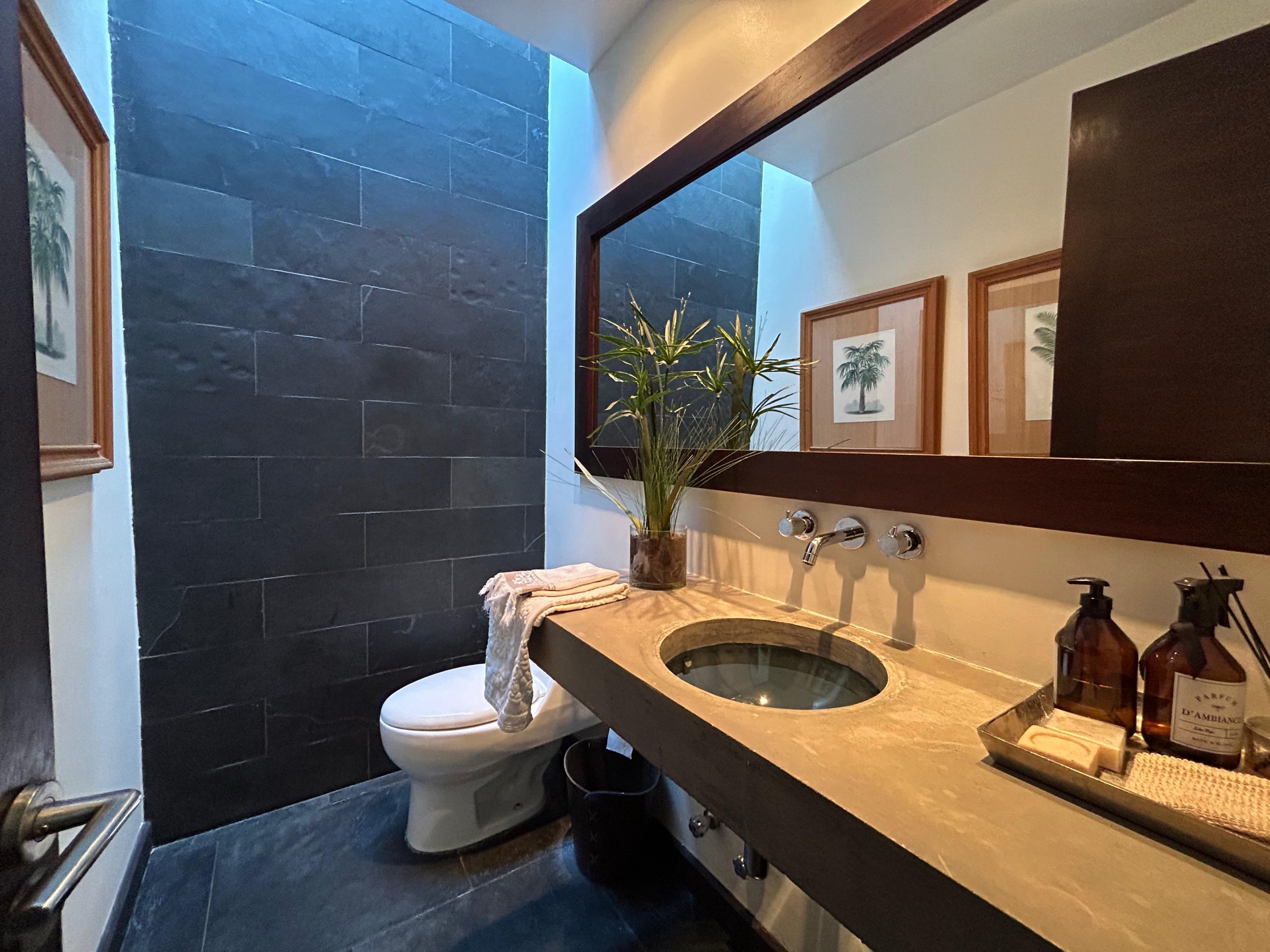 Hall de entrada en doble altura con pisos en piedra natural y baño de visitas.