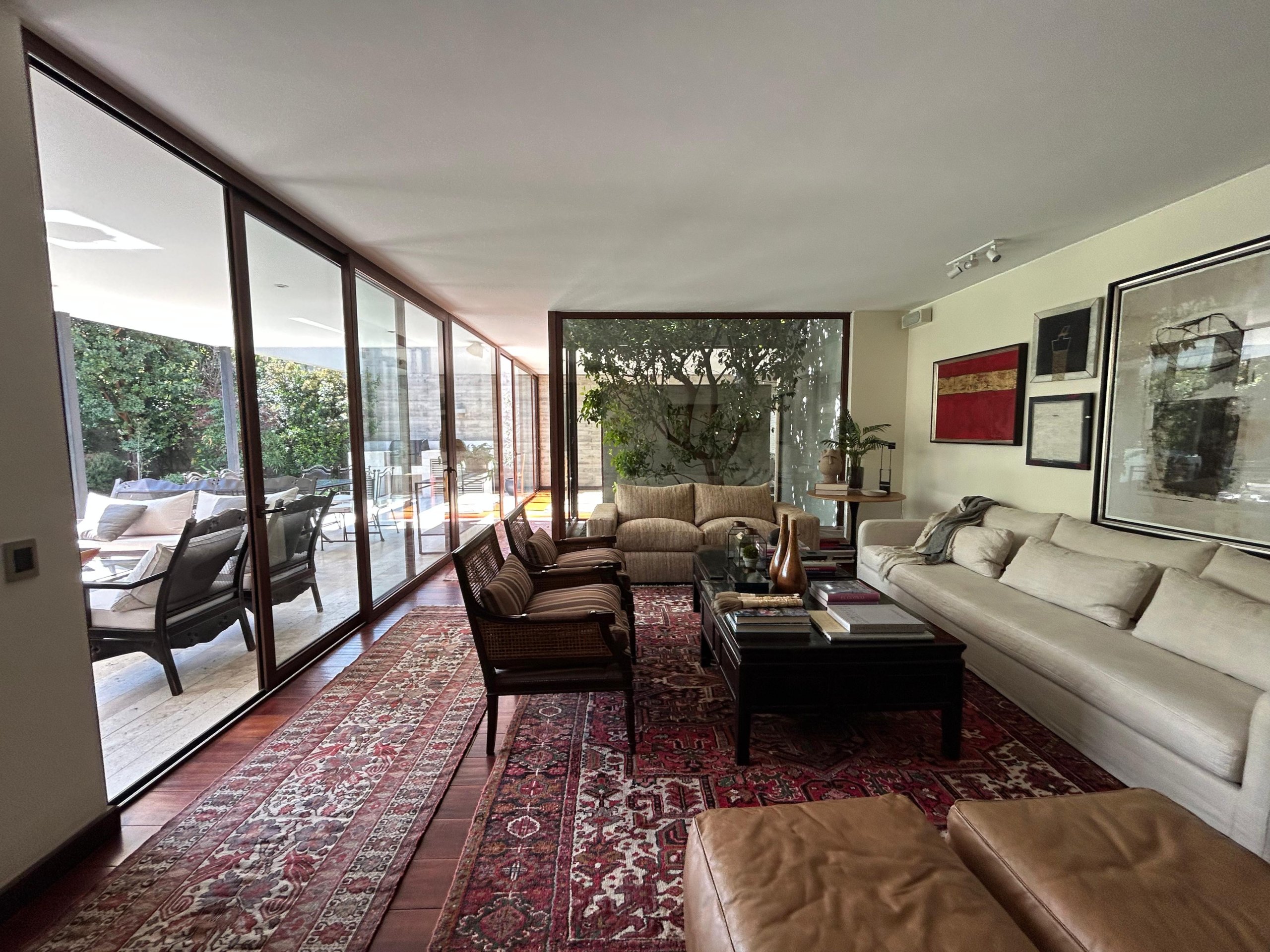 Living y comedor independientes, separados por un jardín interior, ambos con salida a terrazas techadas.