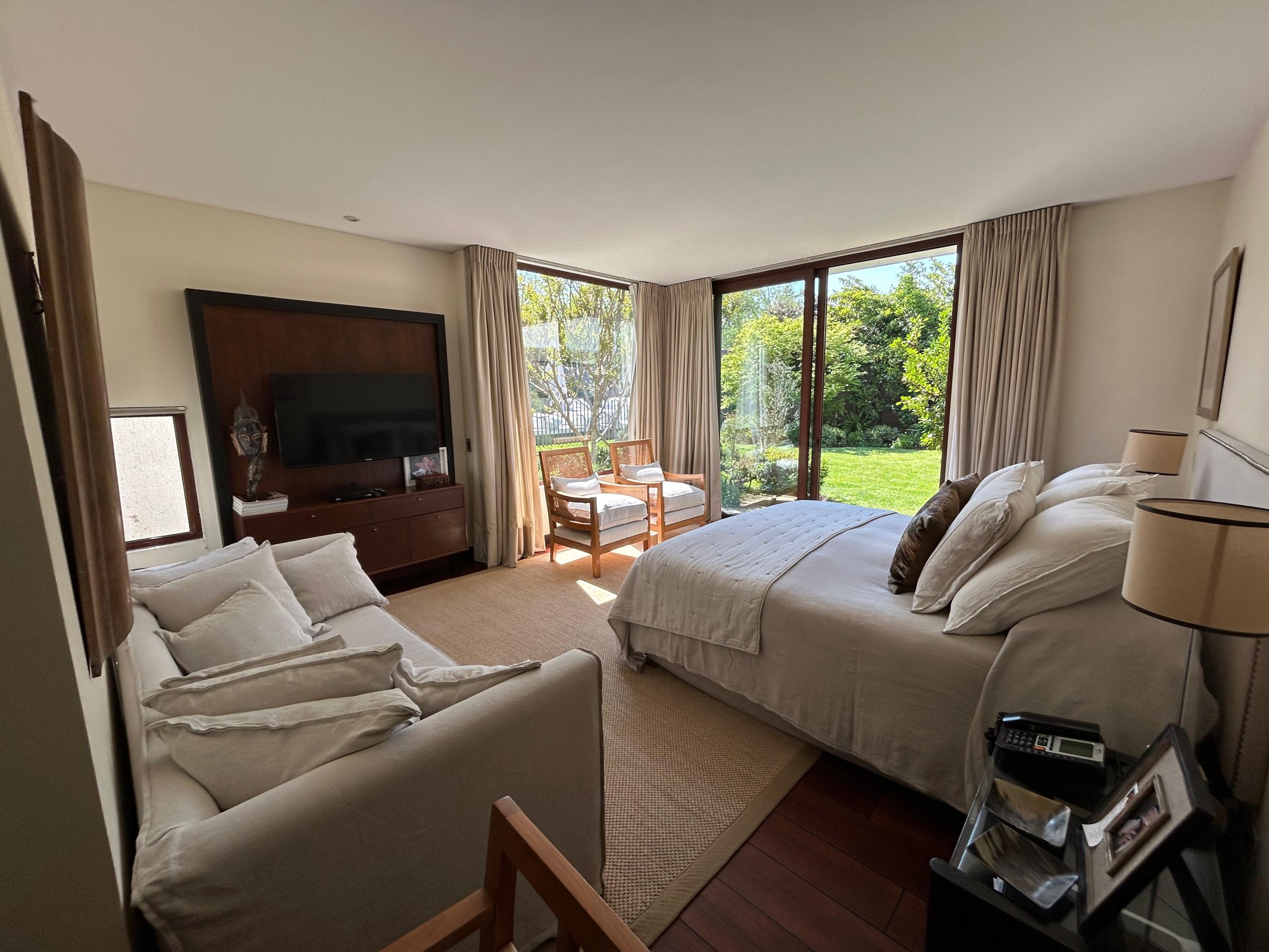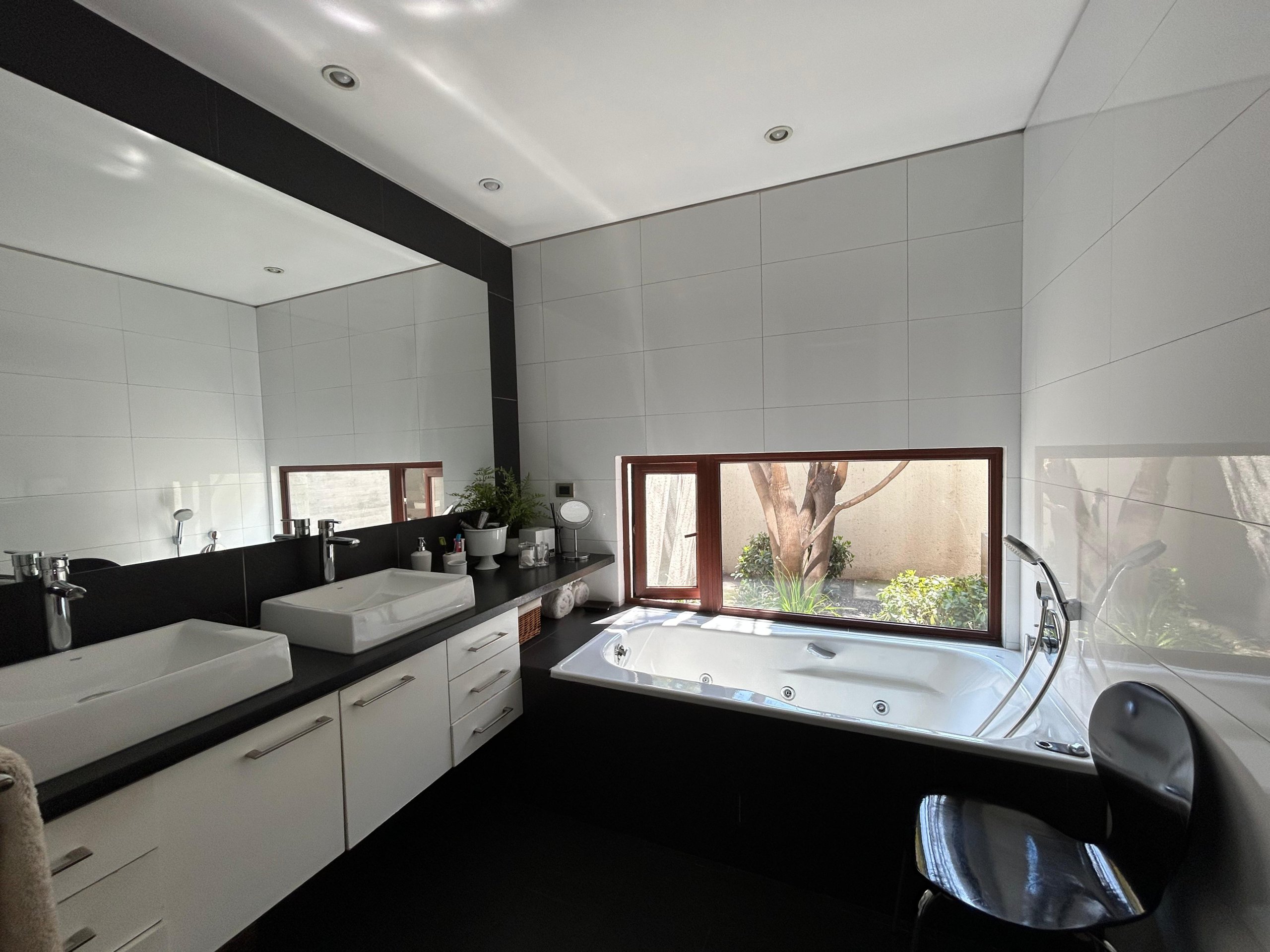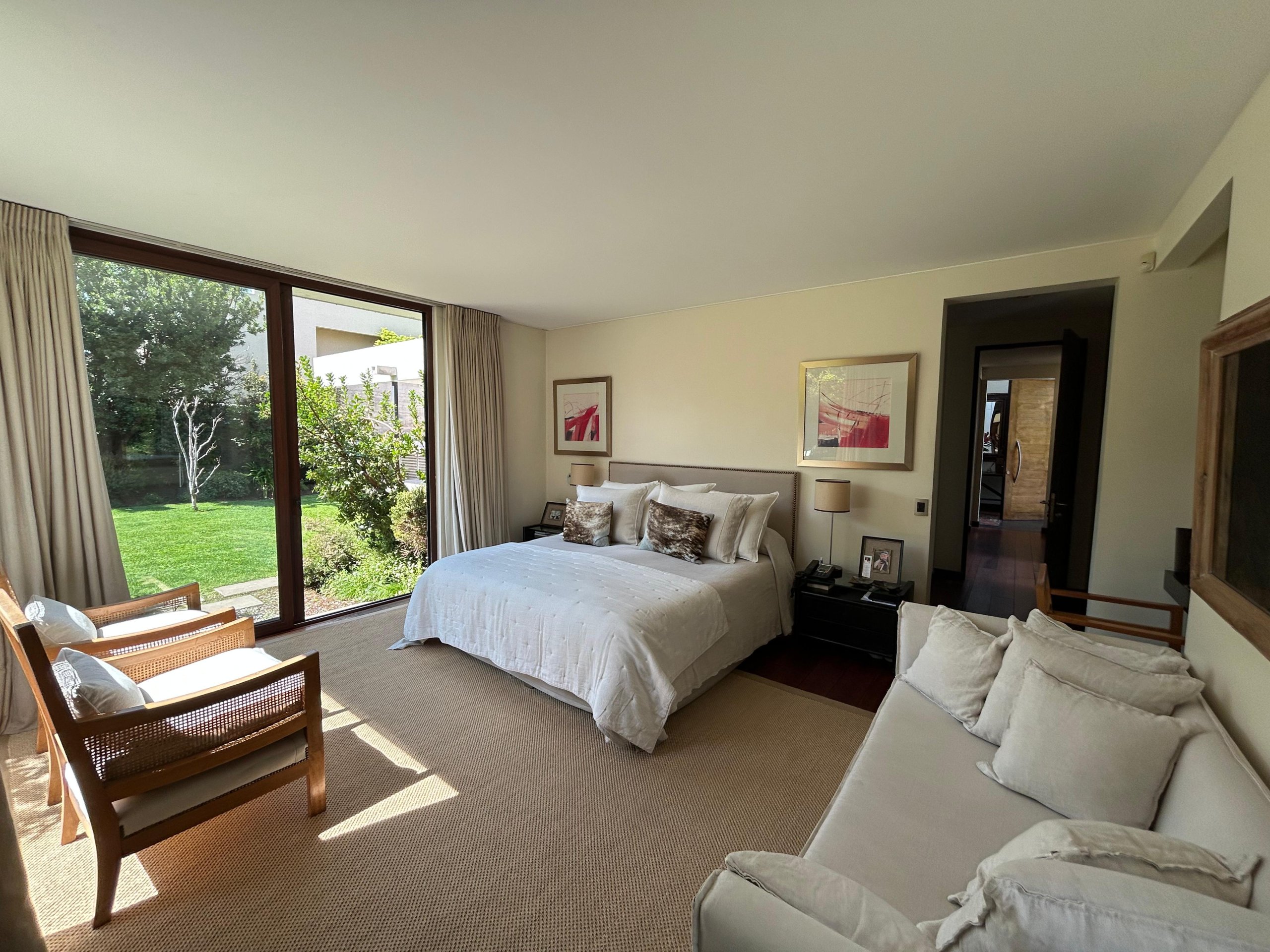 Dormitorio principal en suite, con baño de gran tamaño, jacuzzi, doble vanitorio y salida al jardín.