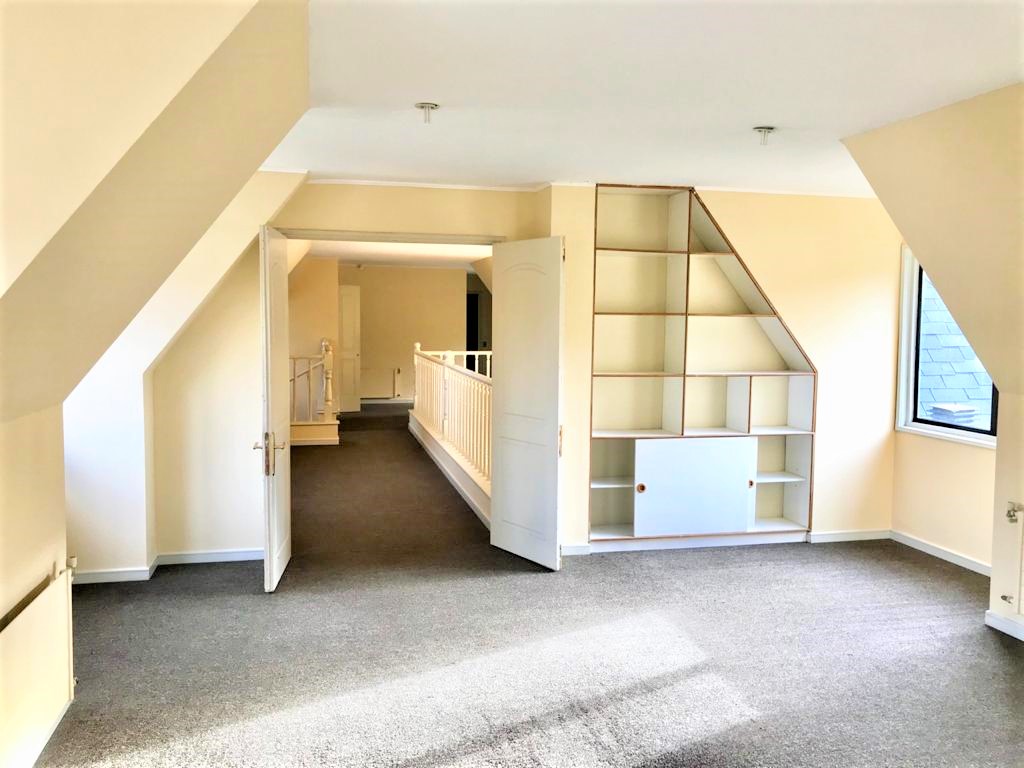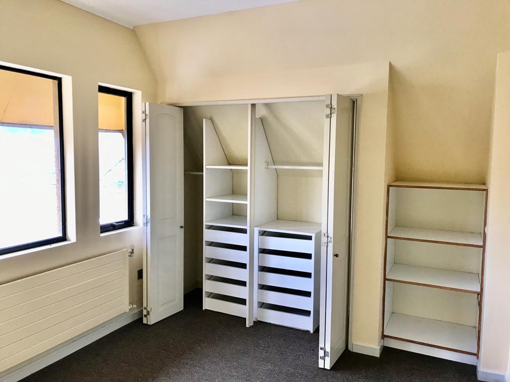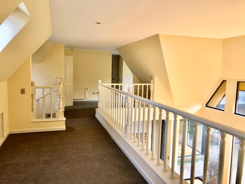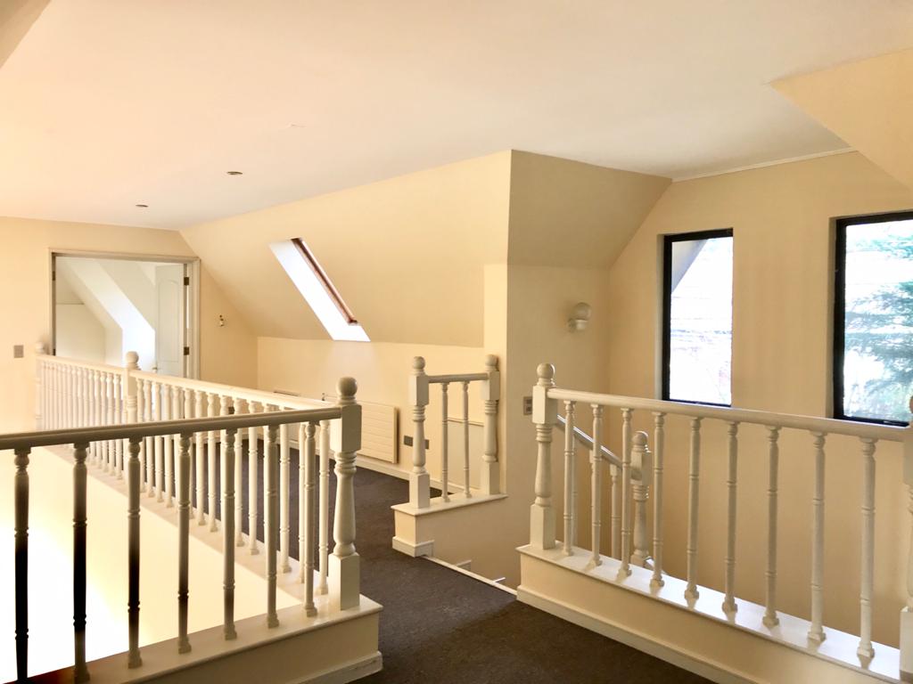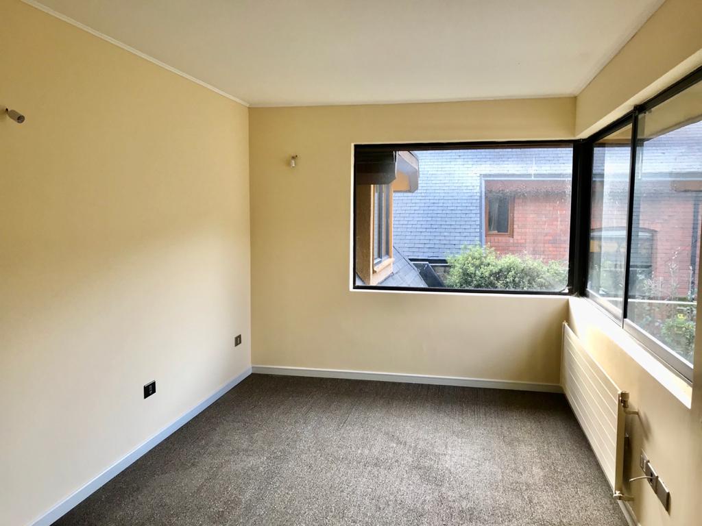 En primer piso; escritorio, baño visita y amplio dormitorio principal en suite con salida a jardín y estar matrimonial.